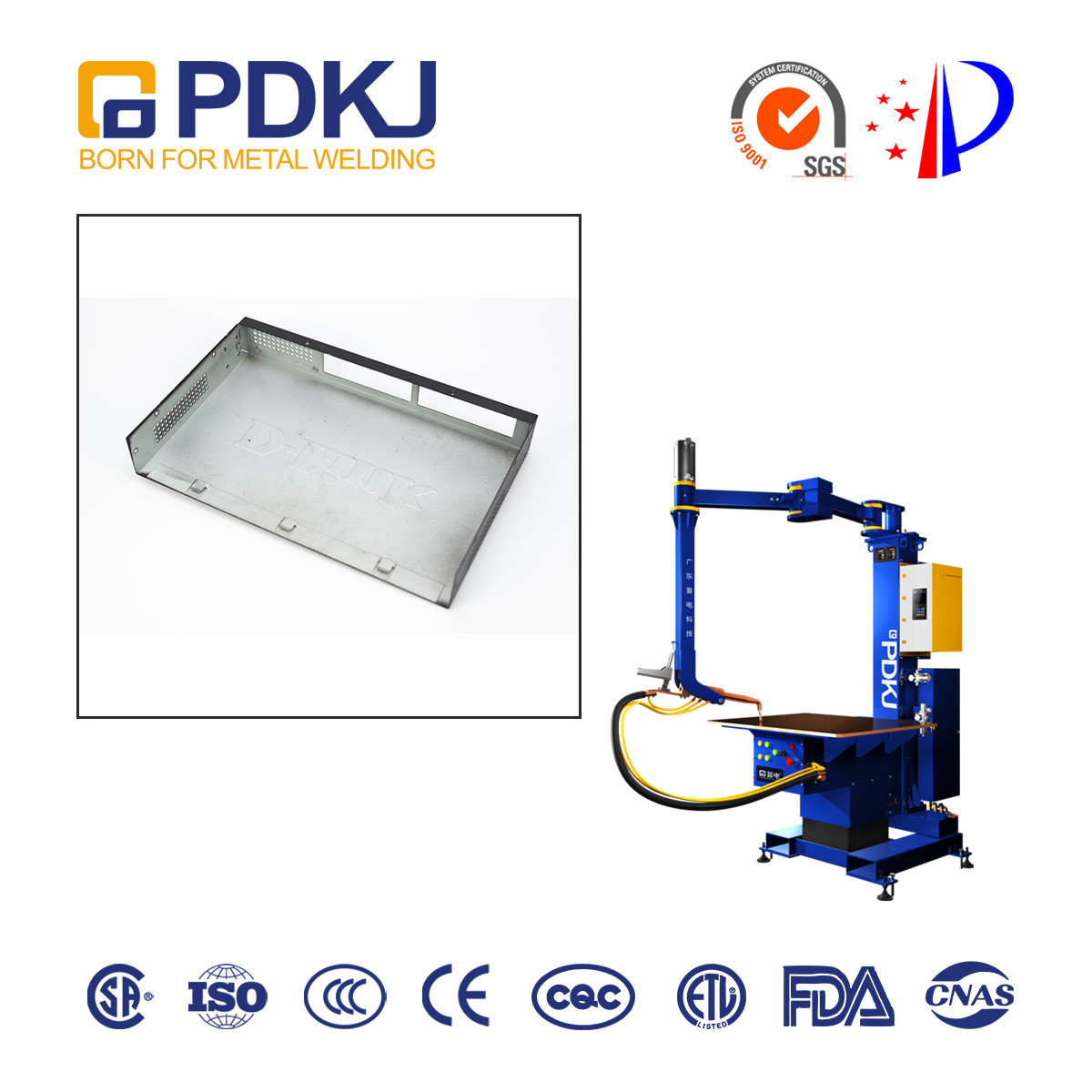 The product has passed the patent certification of China Intellectual Property Office, obtained China CCC certification and export CE certification. It is mainly used in the welding of metal large workpiece products in sheet metal industry, chassis and cabinet, elevator industry, metal door plate, hardware household appliances and other industries. It is applicable to the welding of metal materials such as aluminum, galvanized sheet, stainless steel and low carbon steel, with good performance and high welding quality.